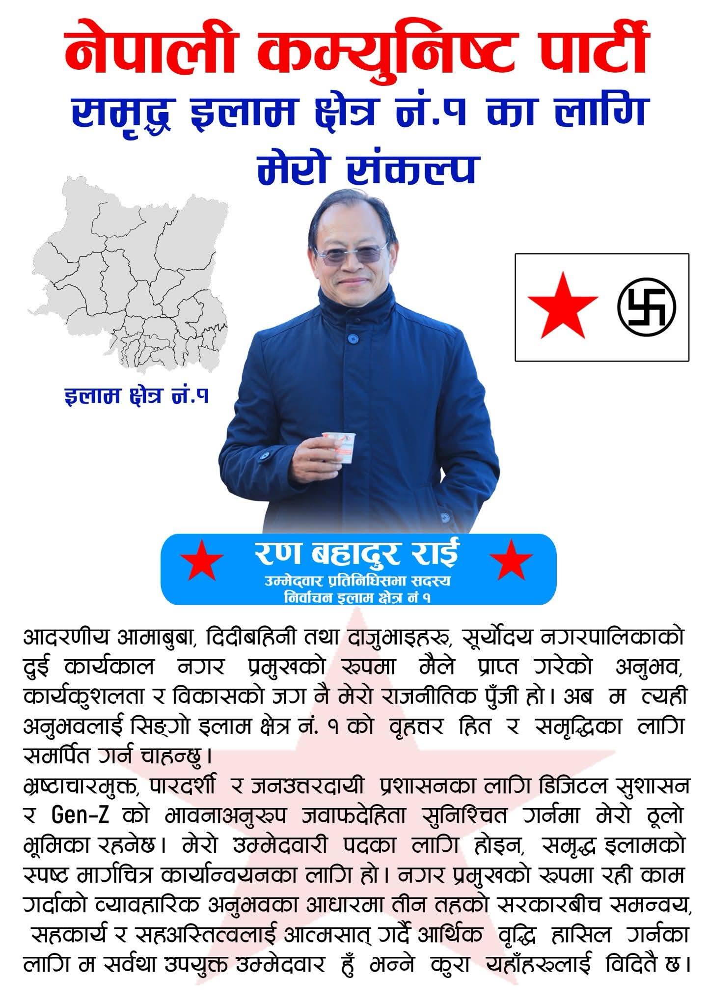 इलाम ।  यही फागुन २१ गते हुने प्रतिनिधि सभा सदस्य निर्वाचनका लागि नेपाली कम्युनिष्ट पार्टीका तर्फबाट इलाम क्षेत्र नं. १ का उम्मेदवार रणबहादुर राईले ‘समृद्ध इलाम’ निर्माणका लागि आफ्नो विस्तृत संकल्पपत्र सार्वजनिक गरेका छन् ।