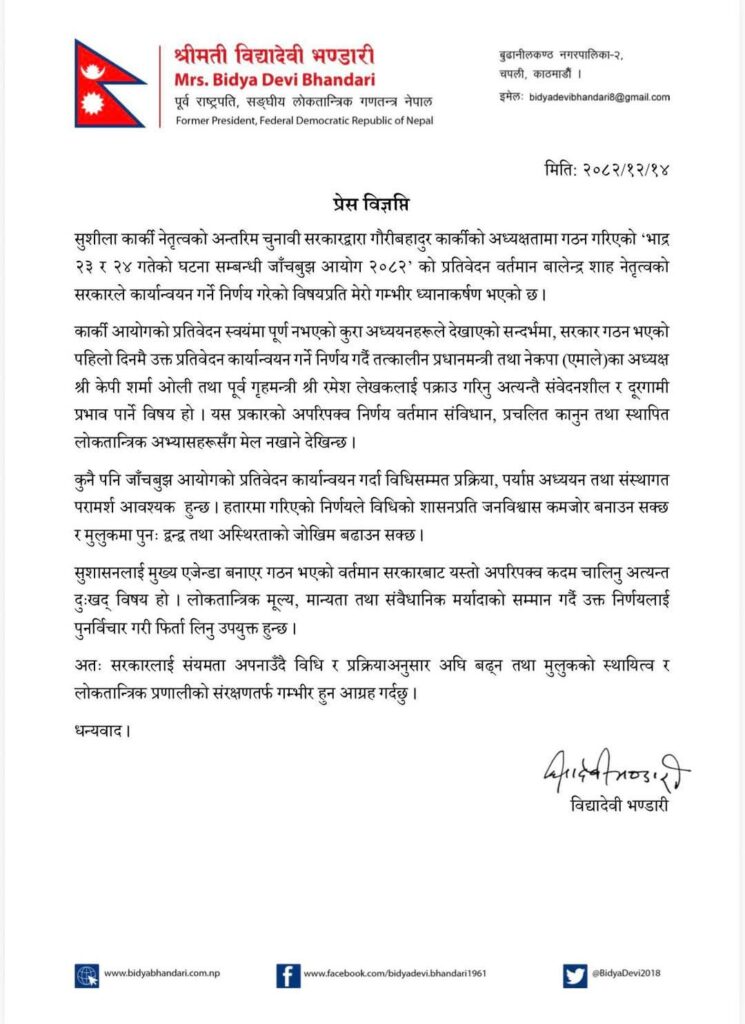 शनिबार जारी प्रेस विज्ञप्तिमा पूर्वराष्ट्रपति भण्डारीले सुशीला कार्की नेतृत्वको अन्तरिम चुनावी सरकारले गौरीबहादुर कार्की अध्यक्षतामा गठन गरेको भदौ २३ र २४ को घटनासम्बन्धी जाँचबुझ आयोगको प्रतिवेदन कार्यान्वयन गर्ने वर्तमान बालेन्द्र शाह नेतृत्वको सरकारको निर्णय संवेदनशील र दूरगामी प्रभाव पार्ने विषय भएको उल्लेख गरेकी छन्।
