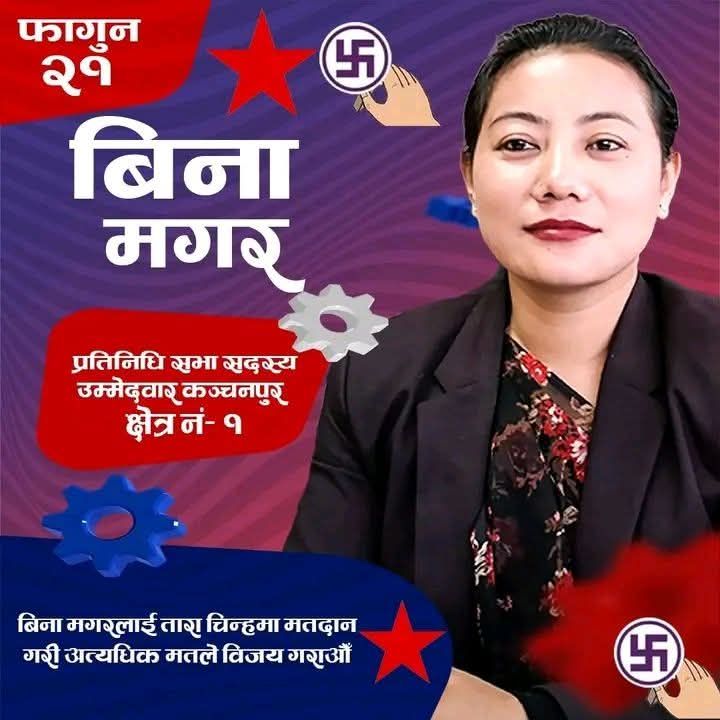 संघर्षको मैदानबाट खारिएकी, विद्यार्थी आन्दोलनको नेतृत्व सम्हालेकी र आधारभूत अधिकारका मुद्दालाई केन्द्रीय एजेण्डा बनाएकी बिना मगरको उम्मेदवारीलाई नेकपाले परिवर्तनको निरन्तरता र स्थायित्वको आधारका रूपमा प्रस्तुत गरेको छ। अनुभव, स्पष्ट कार्ययोजना र जनताप्रतिको उत्तरदायित्व बोकेकी नेतृका रूपमा मगरलाई विजयी गराउनुपर्ने सन्देशसहित कञ्चनपुर–१ मा चुनावी अभियान तीव्र बनाइएको छ।