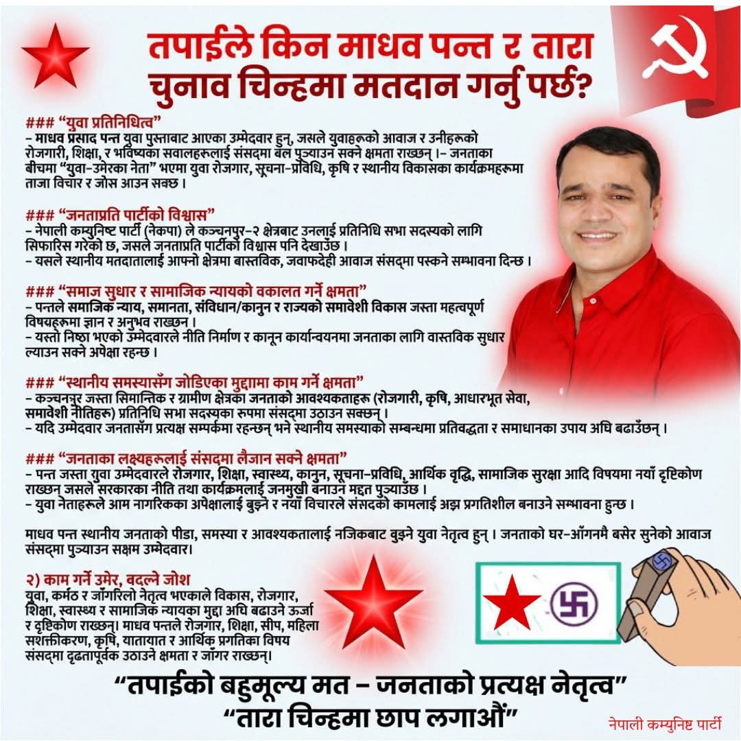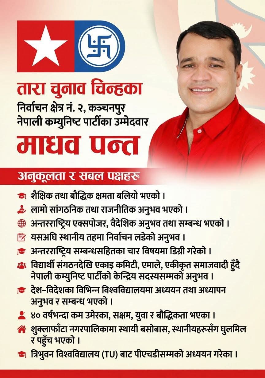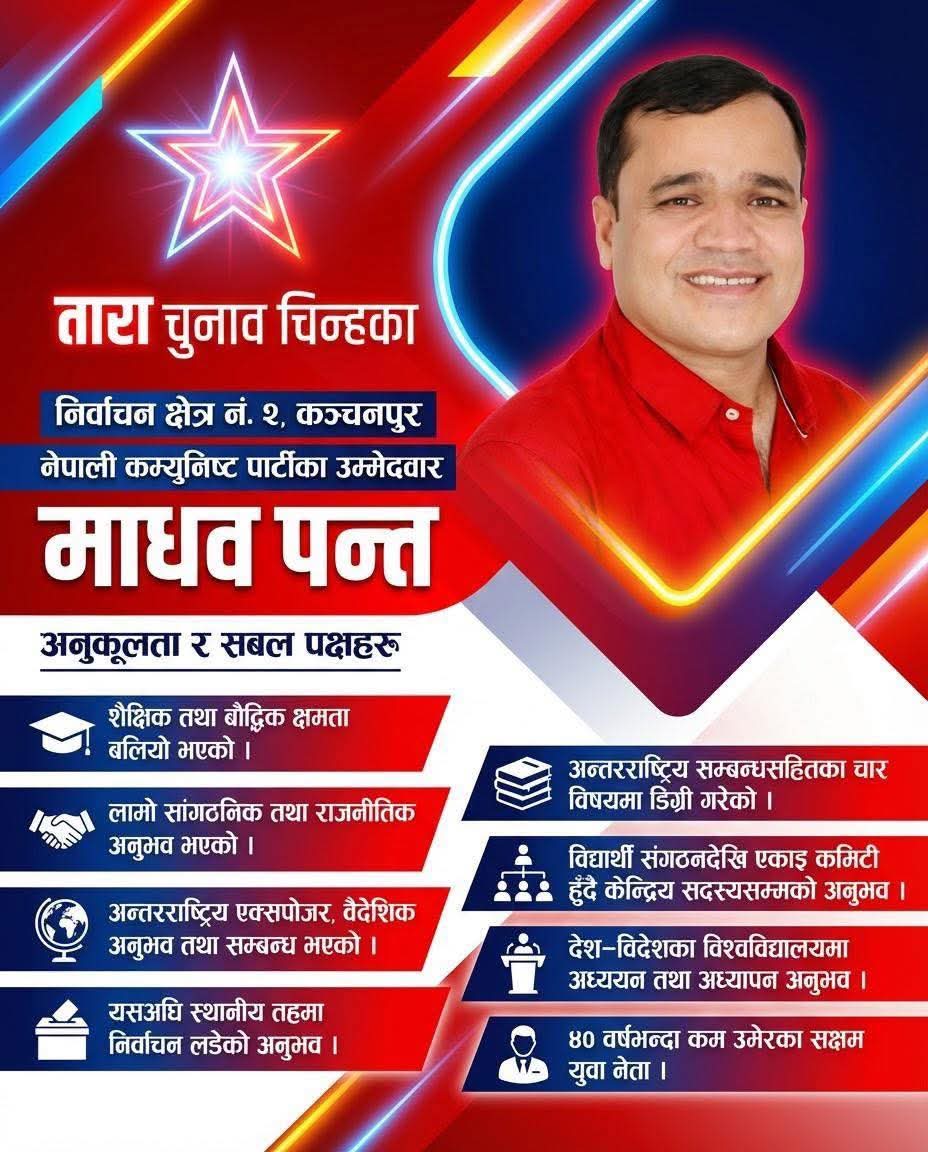 युवा, अध्ययनशील र अन्तर्राष्ट्रिय अनुभव बोकेको नेतृत्वका रूपमा प्रस्तुत भएका पन्तलाई कञ्चनपुर–२ मा मतदाताले कत्तिको विश्वास गर्छन् भन्ने कुरा आसन्न निर्वाचनले तय गर्नेछ।