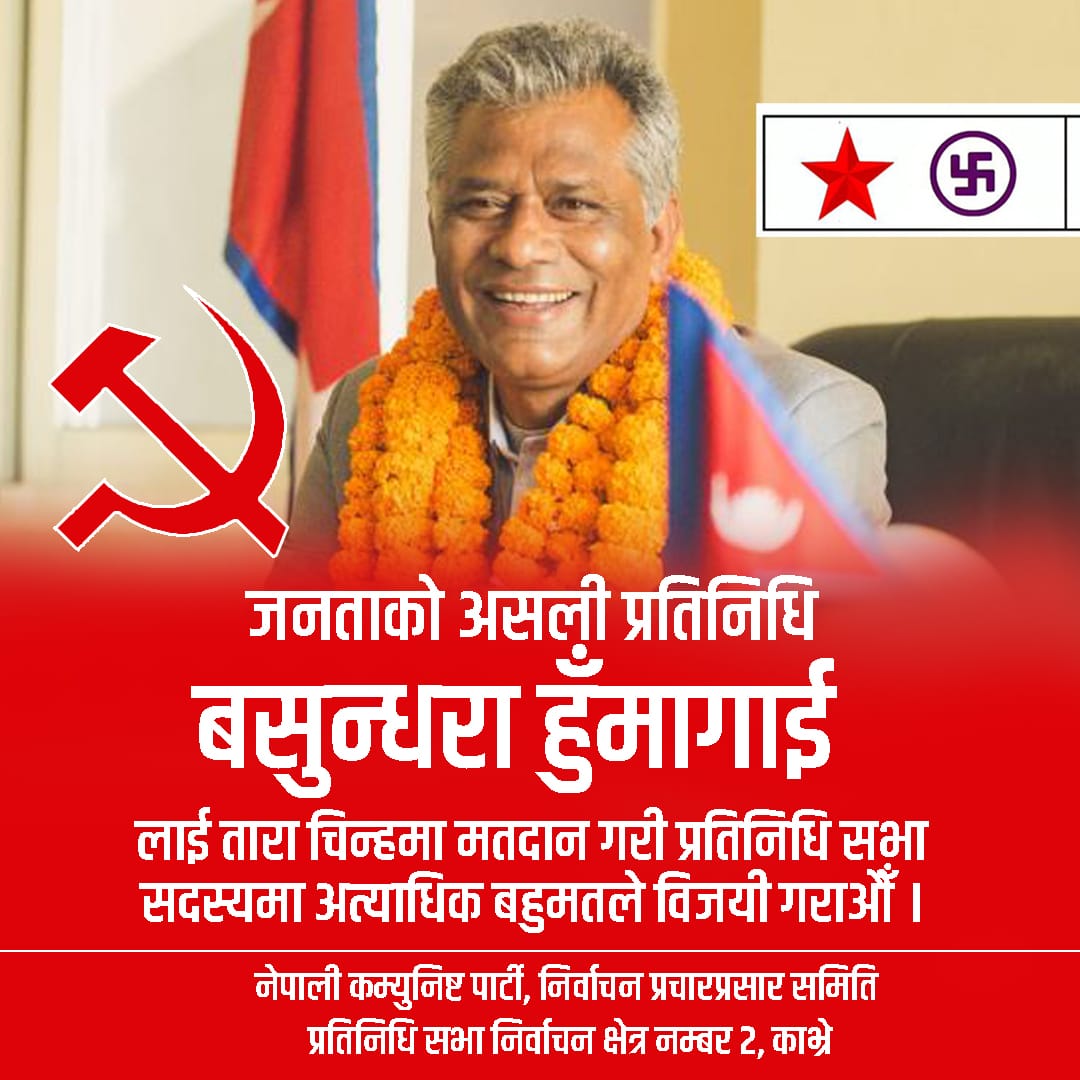 काभ्रेपलाञ्चोक। काभ्रे निर्वाचन क्षेत्र नम्बर २ बाट नेपाली कम्युनिस्ट पार्टीका प्रतिनिधिसभा सदस्य उम्मेदवार बसुन्धरा हुमागाई समाजवादी विचार, न्याय र समानतामूलक विकासको एजेण्डासहित चुनावी मैदानमा उत्रनुभएको छ। सरल स्वभाव र जनमुखी शैलीका कारण किसान तथा मजदुरमैत्री नेताका रूपमा परिचित हुमागाई अहिले पनि सार्वजनिक बसमा यात्रा गर्ने, चोक–चौतारी र चिया पसलमा नागरिकसँग प्रत्यक्ष संवाद गर्ने नेताका रूपमा चिनिनुहुन्छ।