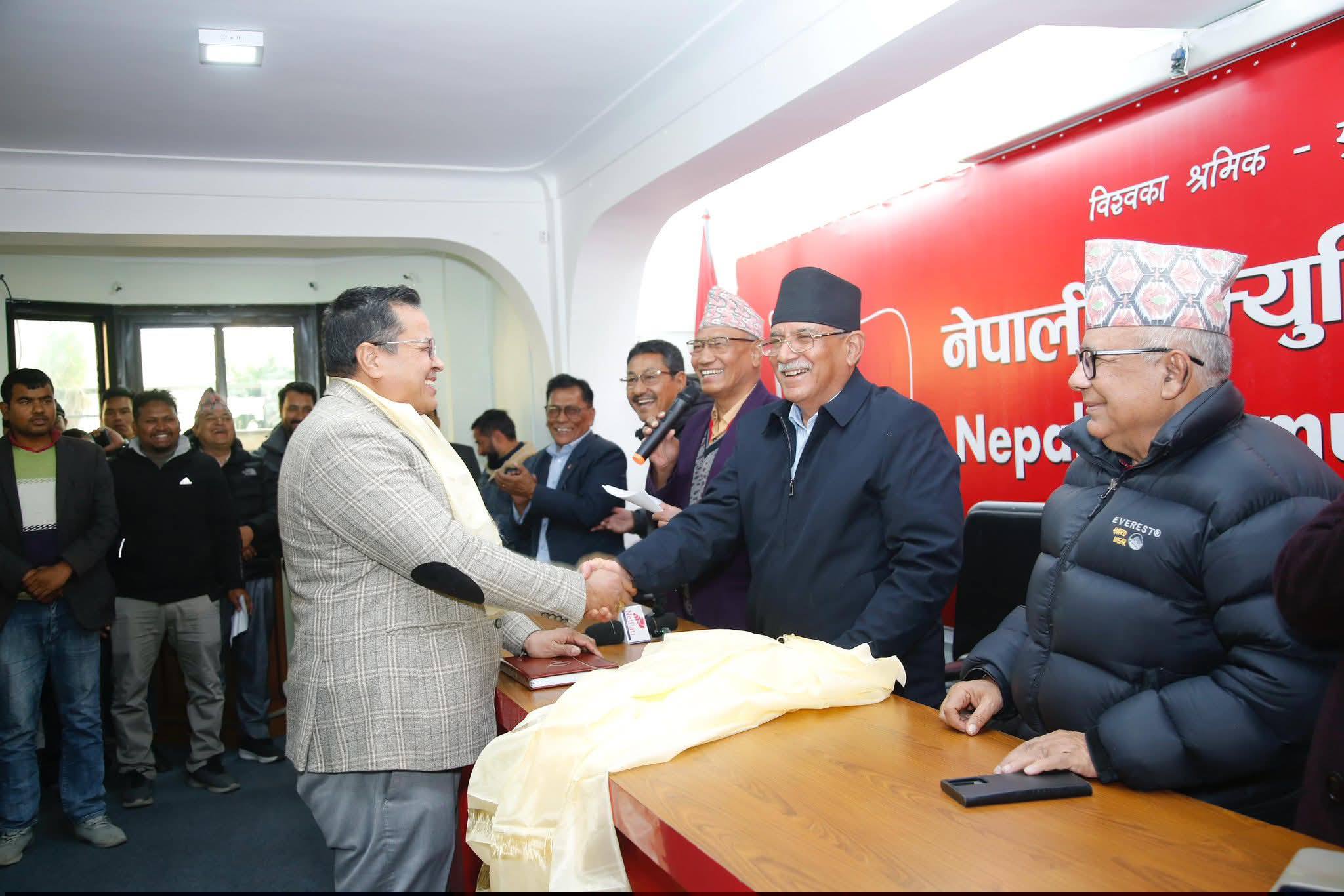उनीहरूलाई नेकपाका संयोजक पुष्पकमल दाहाल ‘प्रचण्ड’ र सहसंयोजक माधव नेपाल लगायतका शीर्ष नेताहरूले खादा र माला लगाएर पार्टीमा स्वागत गरेका छन्।