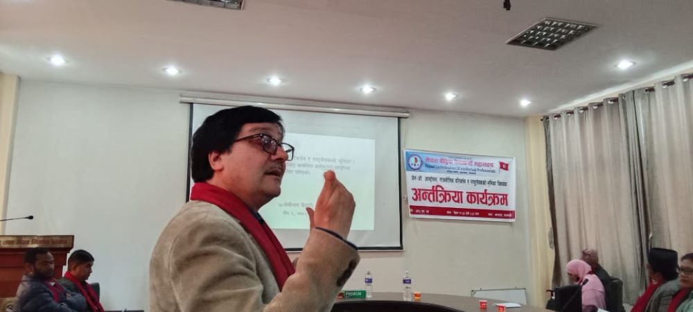 काठमाडौं । नेपाल बौद्धिक पेसाकर्मी महासङ्घ राष्ट्रिय समितिले आज अन्तरक्रिया गरेको छ । काठमाडौंमा आयोजित अन्तरक्रियामा कर्मचारी संघ संगठनका प्रमुखसहित अन्यले पछिल्लो राजनीतिक घटनाक्रमका विषयमा चर्चा गरेका थिए ।
