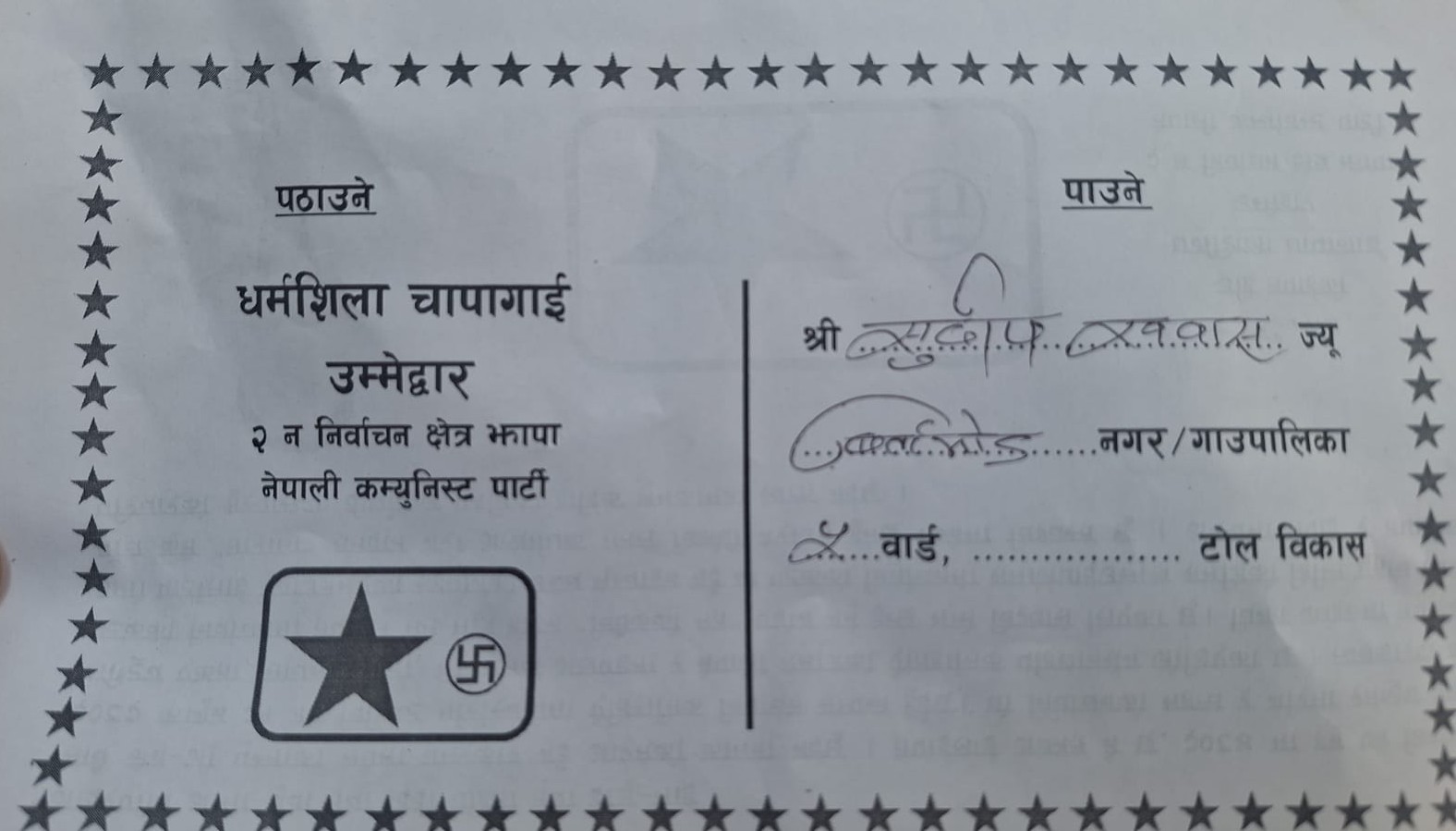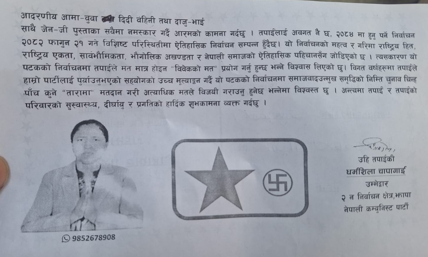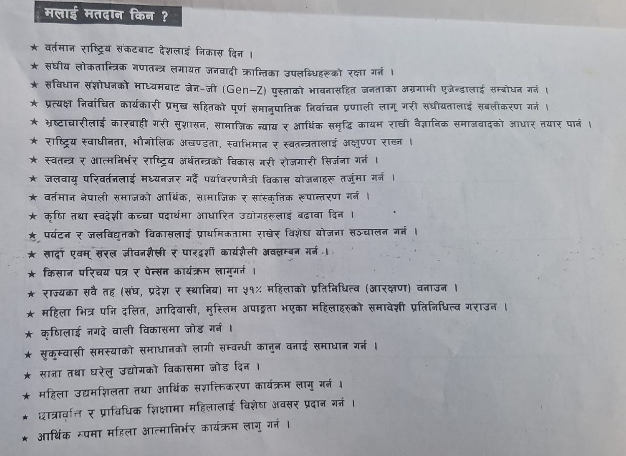 काठमाडौँ । नेपाली कम्युनिष्ट पार्टी झापा क्षेत्र नं. २ कि उम्मेदवार धर्मशिला चापागाँईले बिर्तामोडलाई शिक्षा, व्यापार र स्वास्थ्यलाई क्षेत्रिय हबको रुपमा विकास गर्ने योजना अघि सारेकी छन् । उनले आफ्नो चुनावी प्रतिबद्धता सहित सबै मतदाताको घरघरमा मलाई मतदान किन भन्ने पर्चा पठाएकी छन् ।