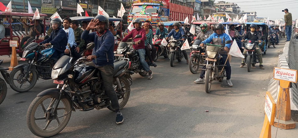 इटहरी । चुनाव प्रचारप्रसारको अन्तिम दिन सुनसरी क्षेत्र नं. २ मा उत्साह र ऊर्जा भरिएको माहोल देखियो । रामकुमारी चौधरीको समर्थनमा नेपाली कम्युनिष्ट पार्टीले तरहरादेखि इटहरीको कान्छीचोक हुँदै झुम्कासम्म विशाल मोटरसाइकल र्याली आयोजना गर्यो । ‘तारा’ अंकित झण्डा फहराउँदै अघि बढेको र्यालीमा समर्थकहरूको उल्लेख्य सहभागिता थियो ।