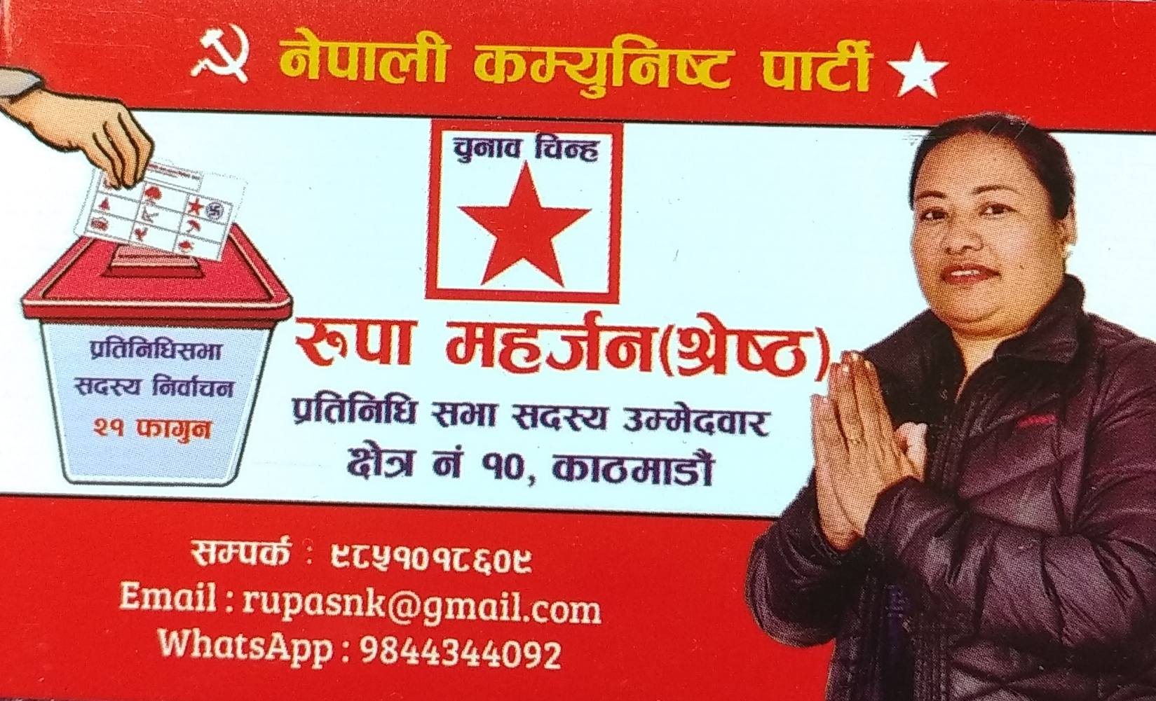 काठमाडौँ । काठमाडौँ क्षेत्र नम्बर १० का मतदाताहरुले पहिलो पटक महिला प्रतिष्पर्धी उम्मेदवारको रुपमा रुपा महर्जन श्रेष्ठलाई पाउनुभएको छ । कुल ८३ हजार ३०१ मत रहेको यस क्षेत्रमा ४२ हजार ७१६ महिला र ४० हजार ५८३ पुरुष मतदाता र अन्य दुईजना रहेका छन् ।