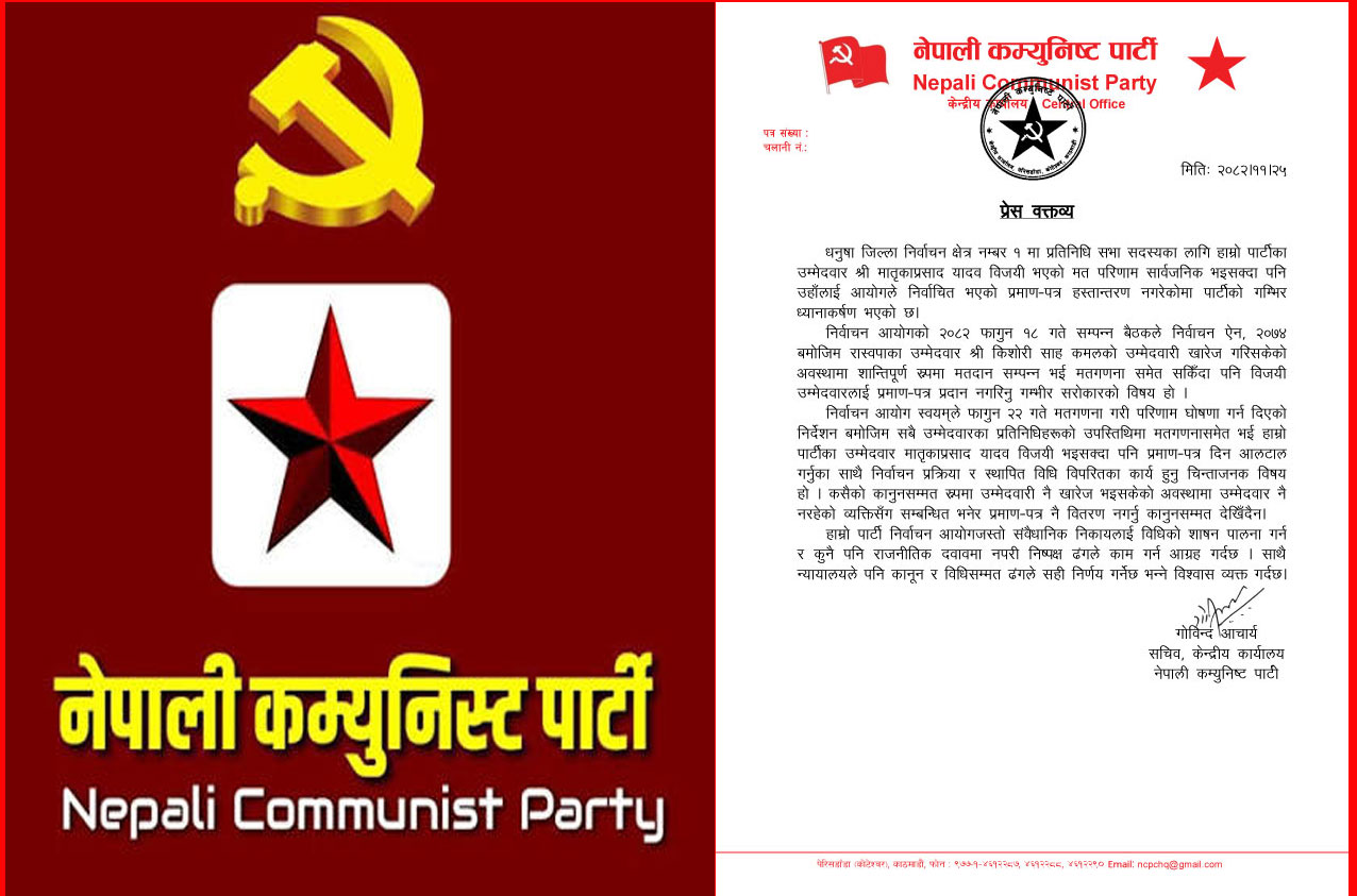 आयोगकै निर्देशनअनुसार फागुन २२ गते सबै उम्मेदवारका प्रतिनिधिहरूको उपस्थितिमा मतगणना सम्पन्न भएको र सो मतपरिणामअनुसार नेपाली कम्युनिस्ट पार्टीका उम्मेदवार मातृकाप्रसाद यादव विजयी भइसकेको पार्टीले जनाएको छ। तर, यस्तो स्पष्ट परिणाम हुँदाहुँदै पनि निर्वाचन आयोगले प्रमाणपत्र प्रदान गर्न आलटाल गर्नु तथा निर्वाचन प्रक्रिया र स्थापित विधि विपरीतका गतिविधि देखिनु चिन्ताजनक रहेको वक्तव्यमा उल्लेख गरिएको छ।