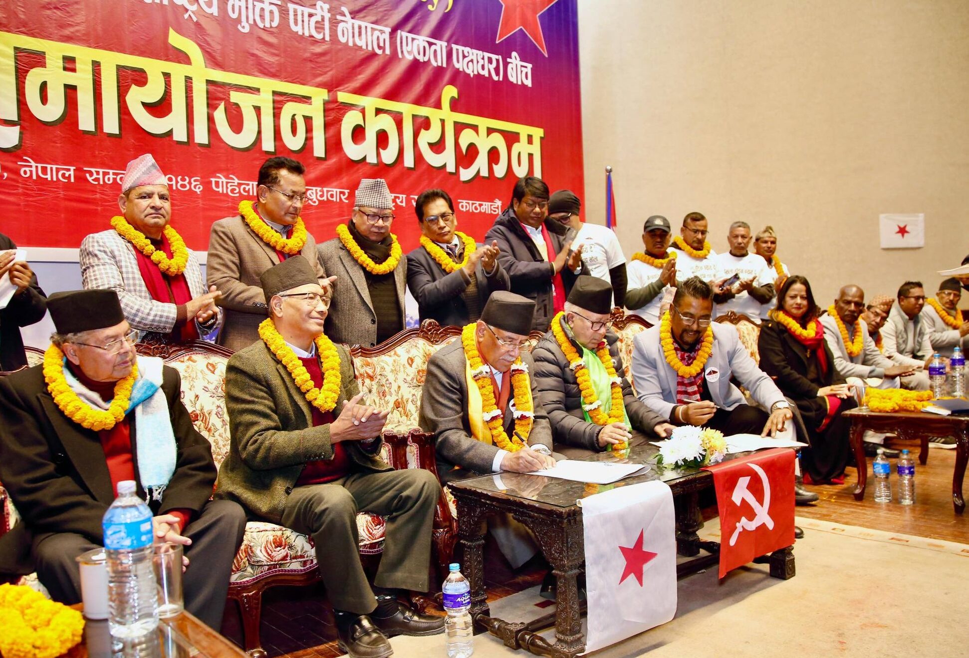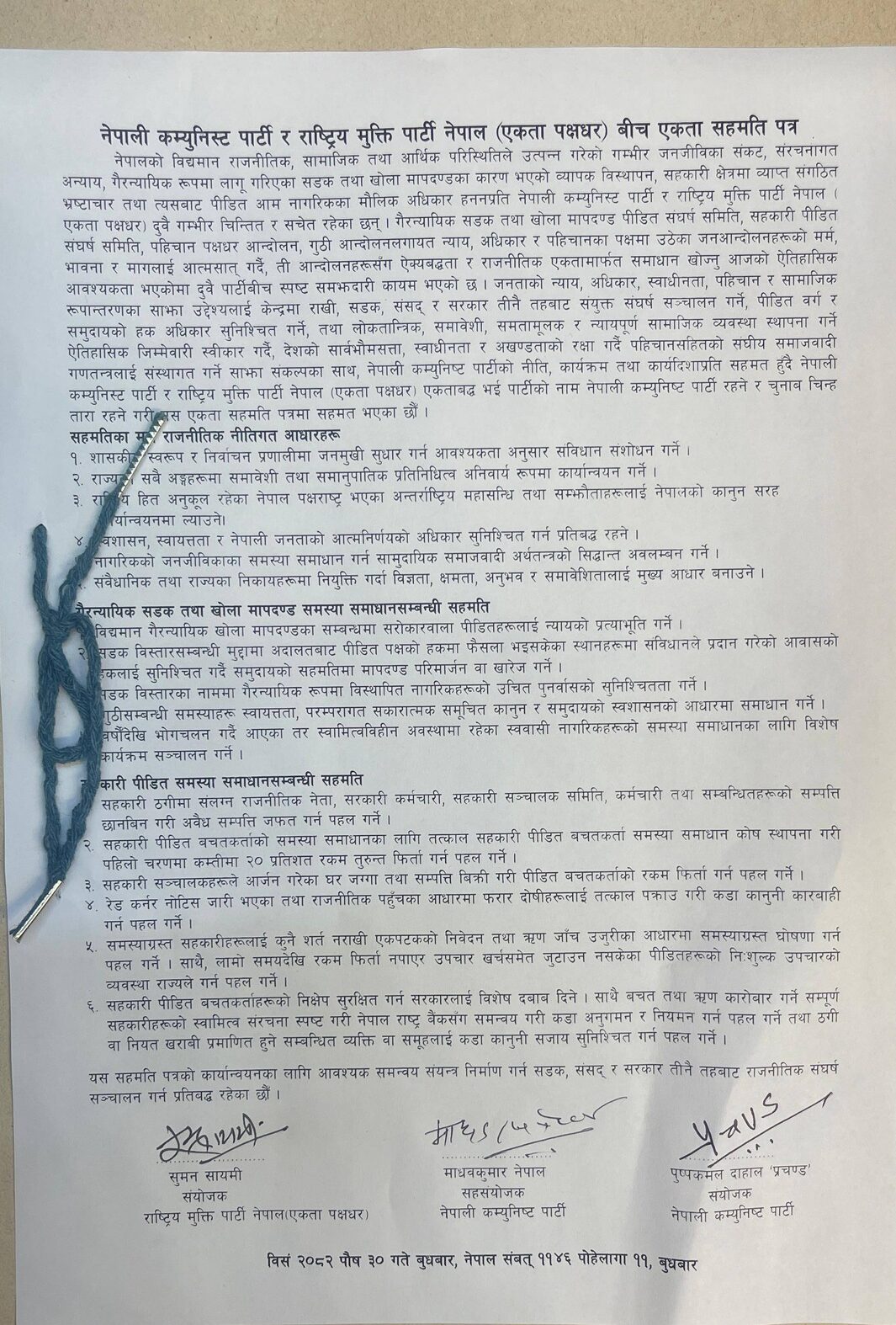 सहमतिपत्रमा नेपाली कम्युनिष्ट पार्टीका संयोजक पुष्पकमल दाहाल, सहसंयोजक माधवकुमार नेपाल तथा राष्ट्रिय मुक्ति पार्टी नेपाल (एकता पक्षधर) का वरिष्ठ उपाध्यक्ष सुमन सायमीले हस्ताक्षर गरेका थिए ।