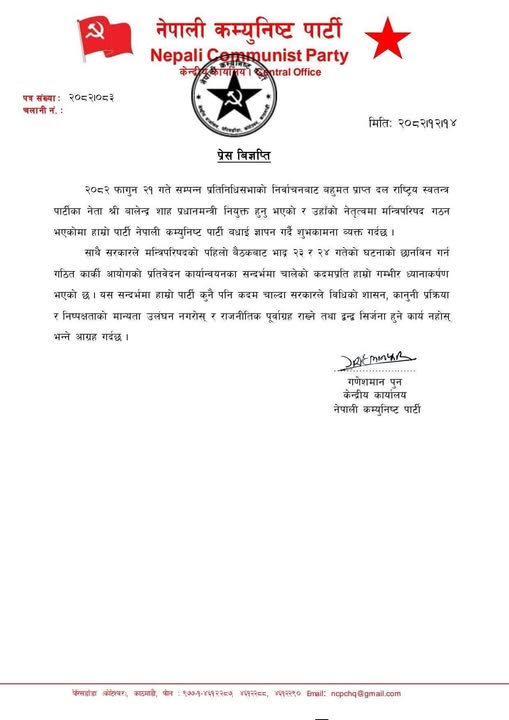 यसअघि प्रतिनिधिसभाको निर्वाचनबाट बहुमत हासिल गरेको राष्ट्रिय स्वतन्त्र पार्टी का नेता बालेन प्रधानमन्त्री नियुक्त भएका छन्। नेकपाले नयाँ सरकारले लोकतन्त्र र शान्ति कायम राख्ने आशा व्यक्त गरेको छ।