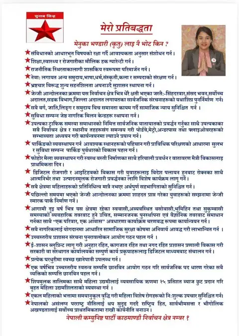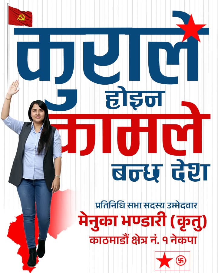 काठमाडौँ । नेपाली कम्युनिष्ट पार्टीको तर्फबाट काठमाडौँ निर्वाचन क्षेत्र नम्बर १ मा उम्मेदवार बनेकी मेनुका भण्डारी (कृतु) ले आफ्नो प्रचार अभियानलाई तिब्र बनाएकी छन् । अन्यत्र झैं यहाँको चुनावी माहोल पनि उच्च बिन्दुमा पुगेको बेला घरदैलो अभियानलाई तीव्र बनाएकी उम्मेदवार भण्डारीले टोल–टोल र घर–घर पुगेर मतदातासँग प्रत्यक्ष संवाद गरिरहेकी छन्।