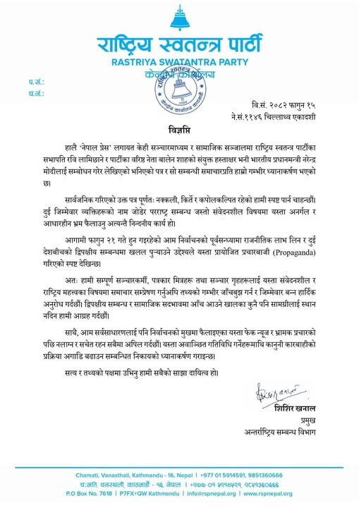 काठमाडौं । राष्ट्रिय स्वतन्त्र पार्टी (रास्वपा)ले पार्टी सभापति रवि लामिछाने र वरिष्ठ नेता बालेन शाहको संयुक्त हस्ताक्षरमा भारतीय प्रधानमन्त्री नरेन्द्र मोदीलाई सम्बोधन गरिएको भनिएको पत्र पूर्णतः नक्कली भएको जनाएको छ।