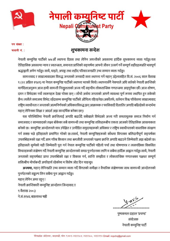 नेपाल कम्युनिस्ट पार्टीको ७७ औँ स्थापना दिवस तथा लेनिन जयन्तीको अवसरमा शुभकामना सन्देश जारी गर्दै उनले वि.सं. २००६ साल वैशाख ९ गते स्थापना भएको कम्युनिस्ट पार्टीले सामन्ती निरङ्कुशताको अन्त्य गरी देशलाई सङ्घीय लोकतान्त्रिक गणतन्त्रको दिशामा डोहो¥याउन ऐतिहासिक भूमिका खेलेको स्मरण गरेका छन्।