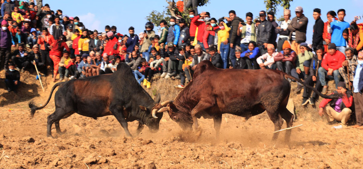 धादिङ । माघे सङ्क्रान्तीको दिन आज धादिङमा एक सय हल गोरु जुधाइएको छ । कृषि कर्मका लागि पालिएका गोरुलाई माघे सङ्क्रान्तिको दिन जुधाउने सांस्कृतिक परम्पराअनुसार जुधाइएको हो । गोरु जुधाई यहाँ रमितेको भीड देखिएको थियो ।